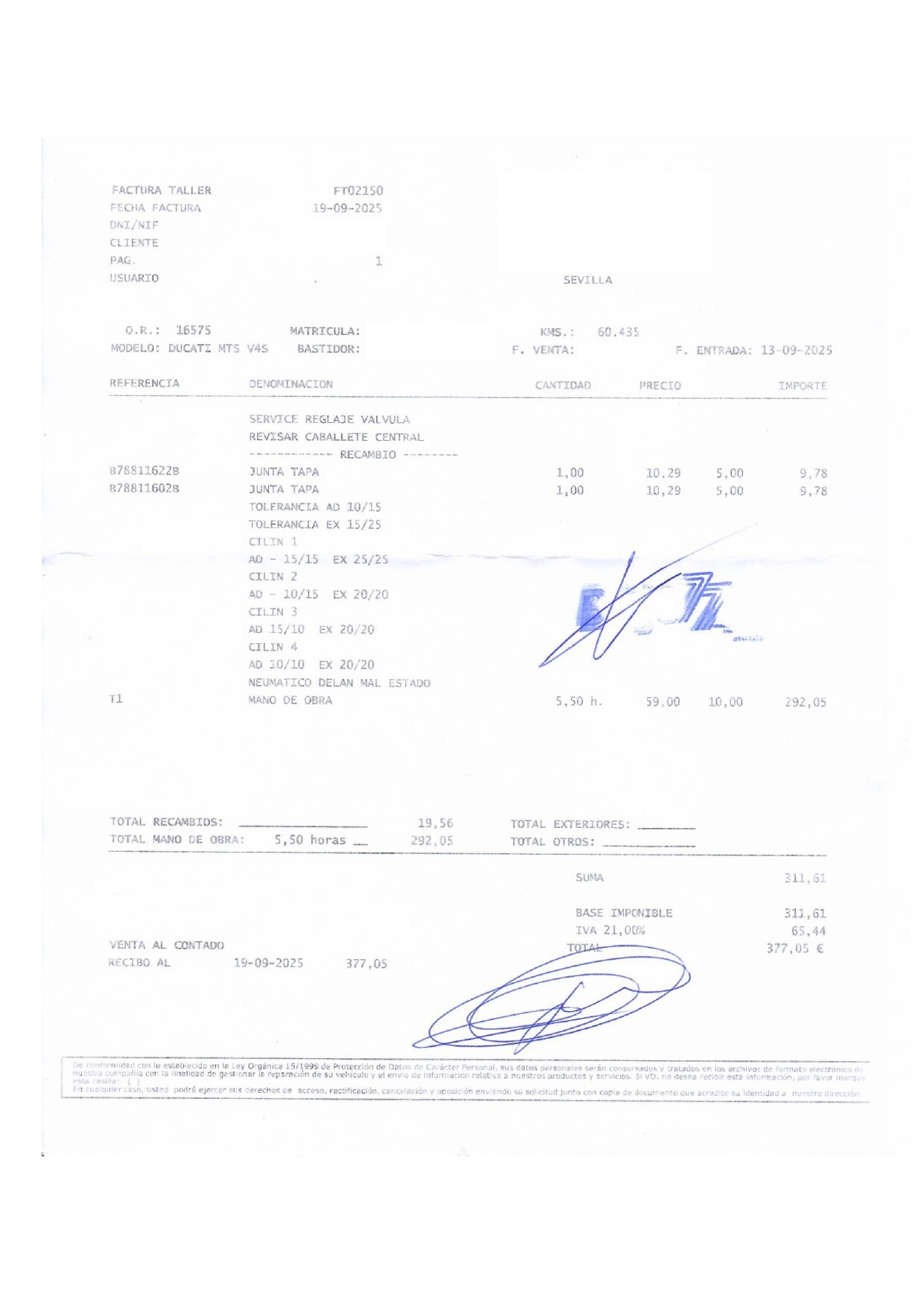 Buenas tardes, hoy he ido a recoger la moto del concesionario una vez terminado el reglaje de válvulas, y aquí dejo la factura. He de decir que ha sido todo una sorpresa después