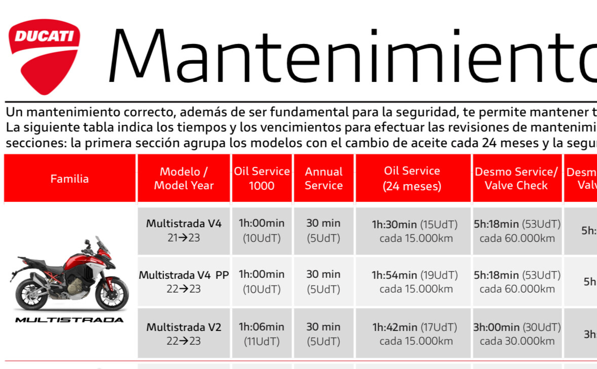 Yo ya he tenido varias Multistrada, 1200S y 1260S y ahora la V4S, y en las anteriores cada 30.000km tenias el reglaje de valvulas y cambio de correas, que junto con kit de arrastre que solía coincidir costaba unos 1.000€ la revisión.