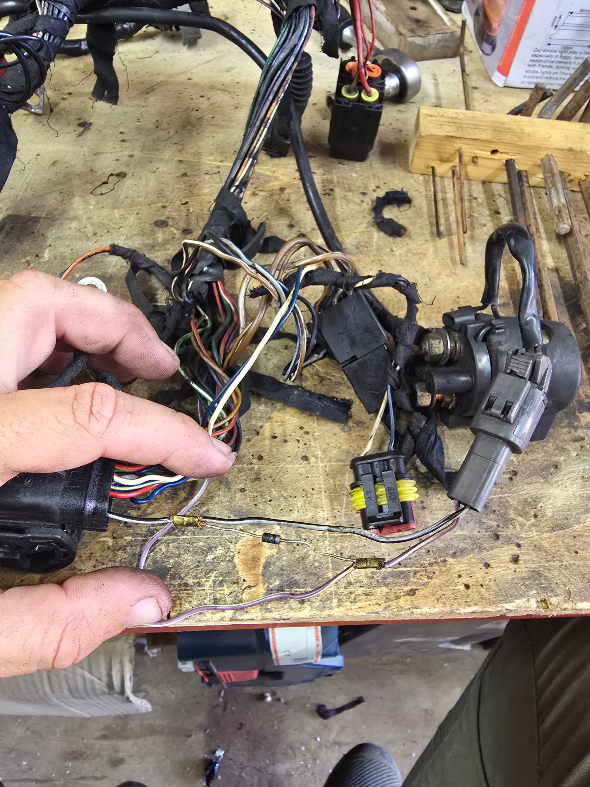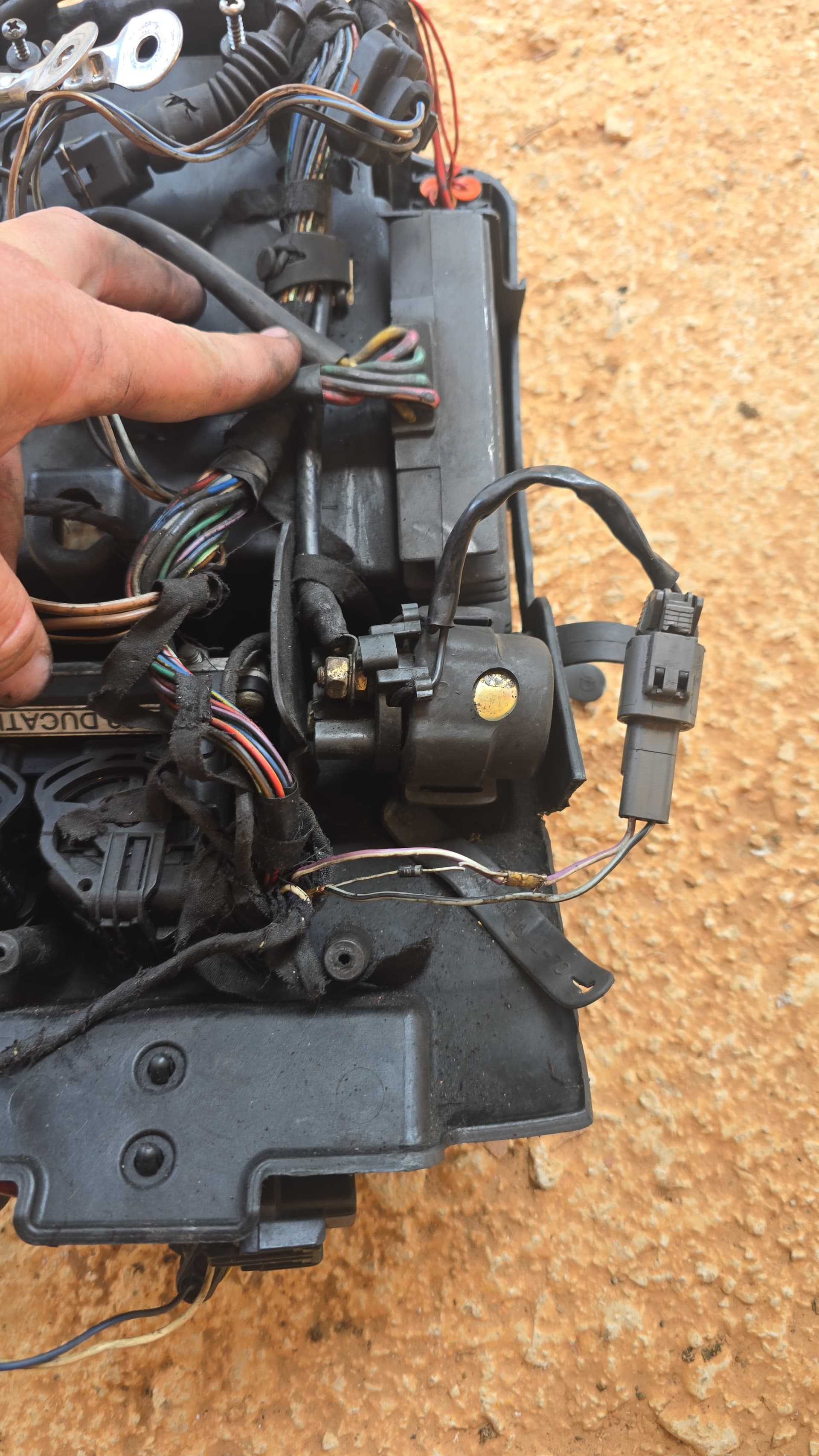 Justo en los dos cables que van al rele de arranque, el anterior propietario empalmaria un diodo N1 4007, un diodo monodireccional, dandole corriente a la centralita, a la vez que al rele, que ya lo hace igual despues de pasar por el rele, por lo que no entiendo nada.