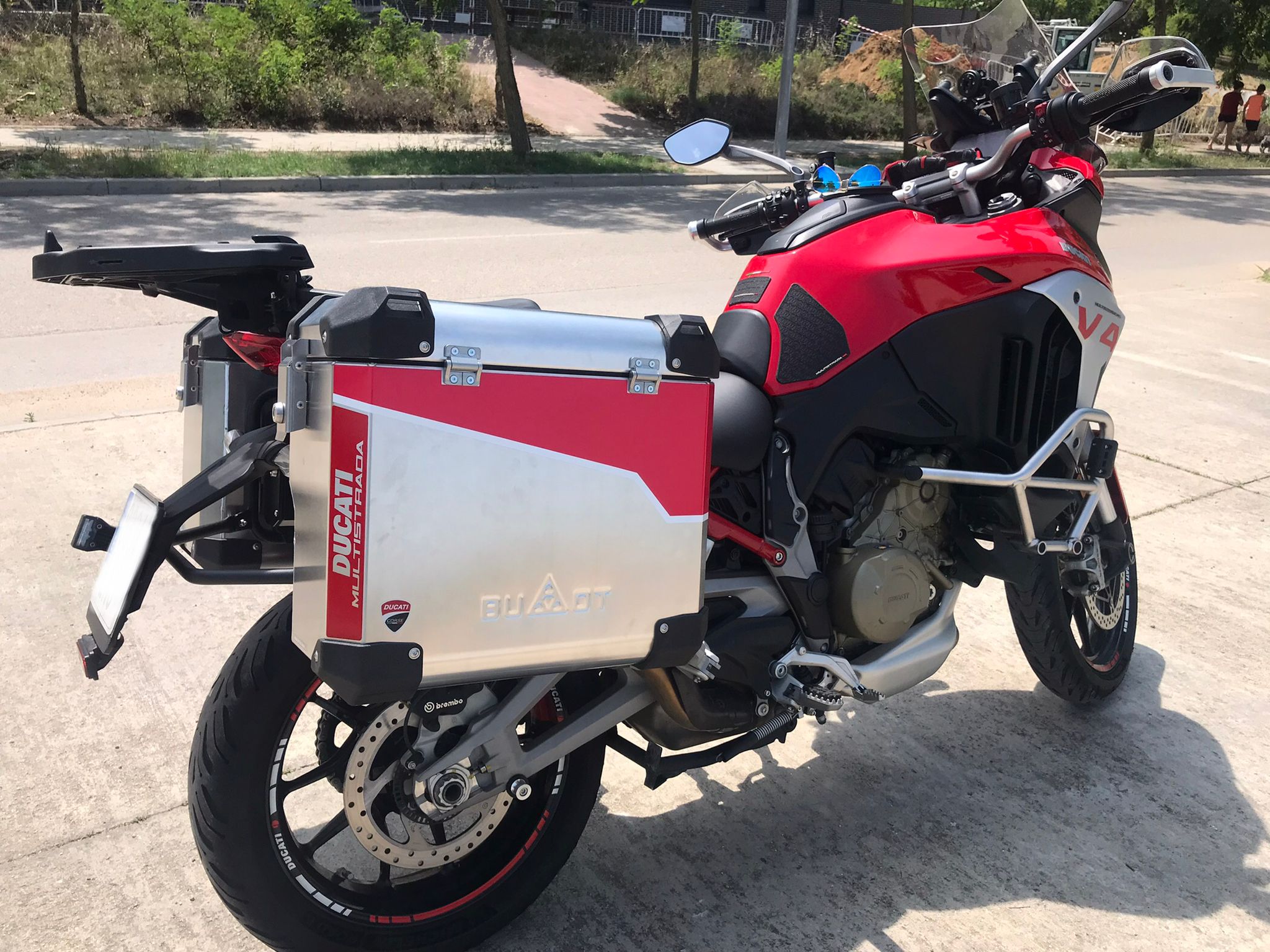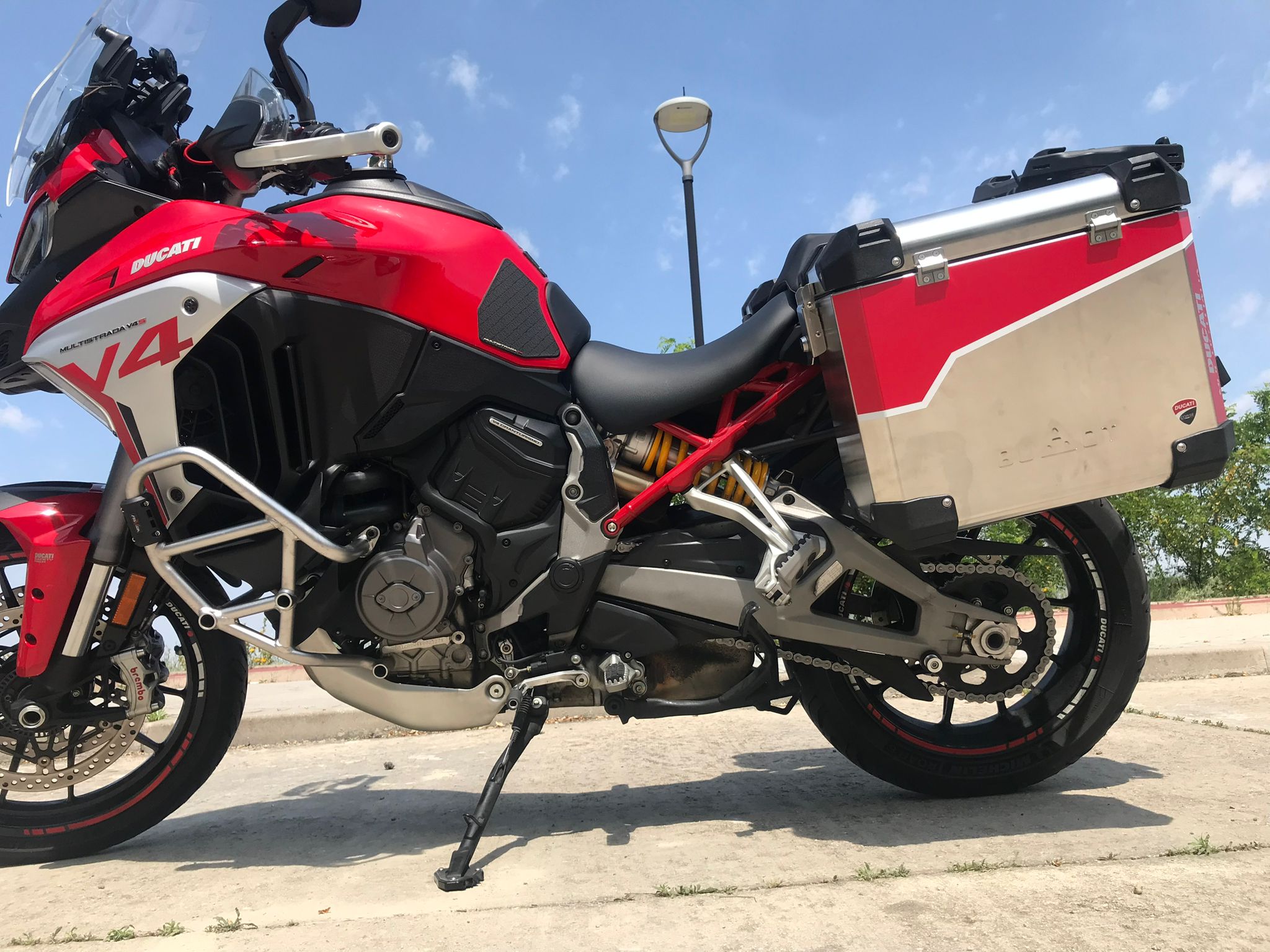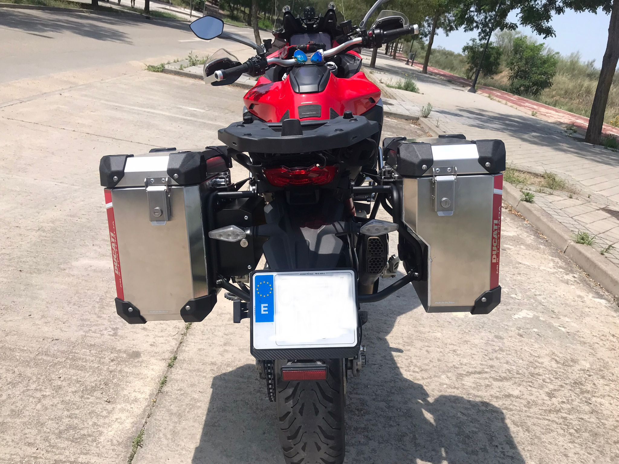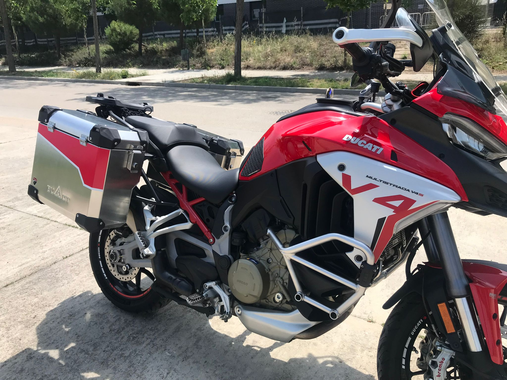 Y ahora entrando en materia, os comento, vendo mi Mulsitrada V4S, año 2021, 40 mil km, todas las revisones al dia en concesiónario oficial (justificables todas ellas con facturas y libro electronico de Ducati). La puedo vender de dos maneras, como viene de serie, pero con las suspensiones rebajadas, que serian de la siguiente manera.: